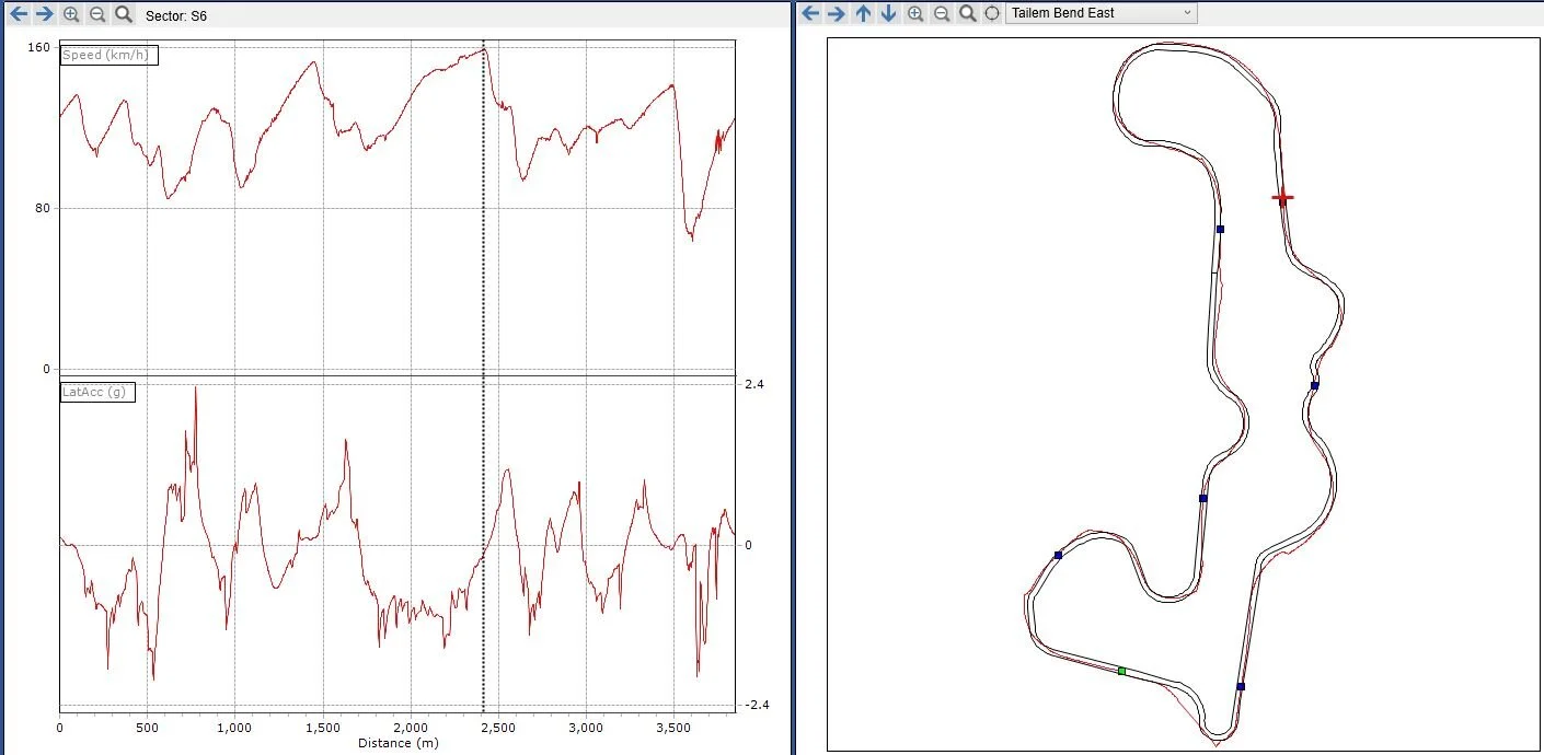 Slowest corner is the run onto the start finish straight at just 67kmh and top speed of 160kmh approaching turn 14 although that's more a reflection of the actual top speed of the Elfin so expect the quick cars to be much faster here.